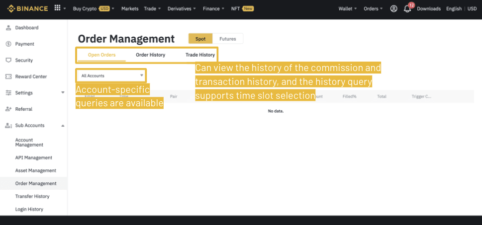 Order Management: You can check [Open Orders], [Order History], and [Trade History] of all your sub-accounts. You can also filter orders by dates and trading pairs.