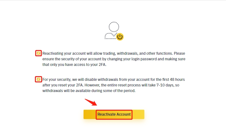 Read the reminder carefully and tick the respective boxes once you accept the terms and given information. Click on the【Reactivate Account】button to proceed further.