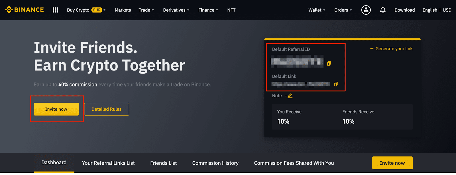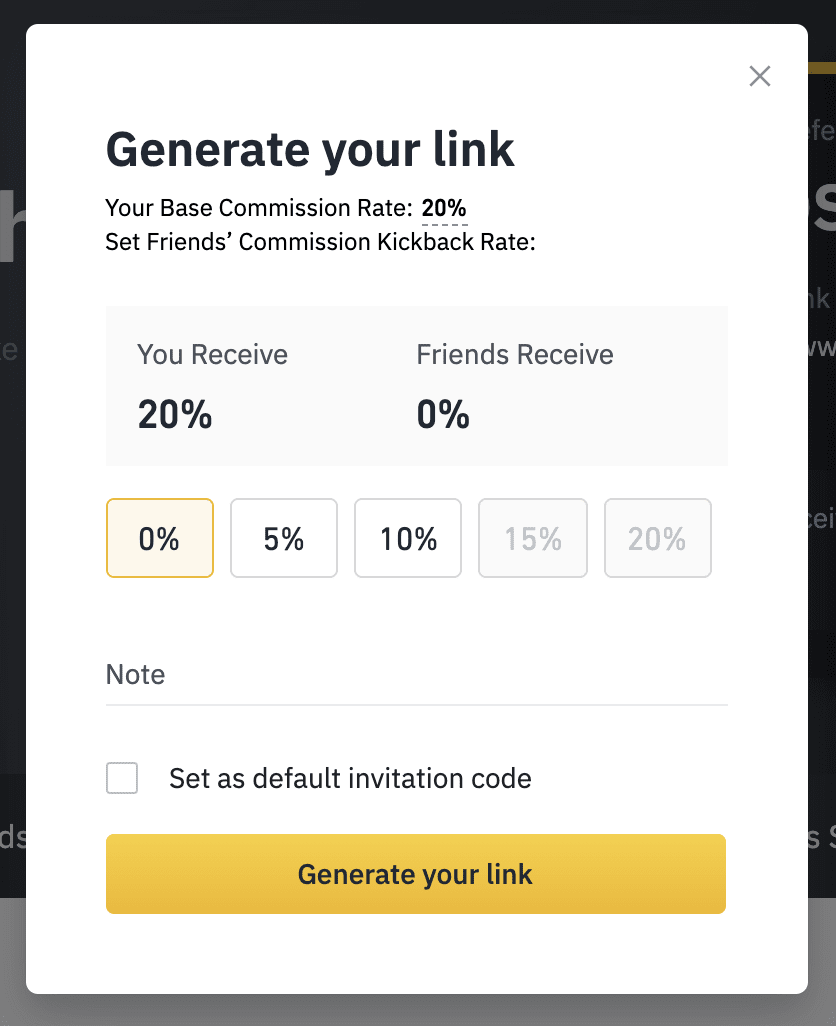 3. Choose the spot referral commission rate. The default spot referral rate is 20%, meaning that you get 20% of the spot trading fees paid by the friends you refer.Please note that accounts with a daily average account balance of 500 BNB or more can get 40% spot referral commission, while accounts with a daily average account balance of less than 500 BNB can get 20% spot referral commission.You can also add a note for the link, and set it as your default rate. Click [Generate your link].