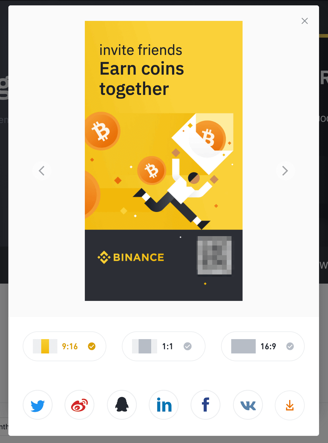 You can also click [Invite Now] to share your referral QR code. You can download the image in different sizes, or click on the various social media icons to share directly.