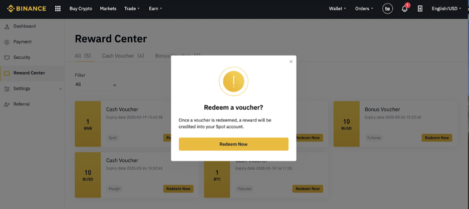 1. Click on your Account icon and select [Reward Center] from the drop-down menu or in your dashboard after logging in to your account. Alternatively, you can directly visit https://www.binance.com/en/my/coupon or access the Reward Center via the “Account” or “More” menu on your Binance App.