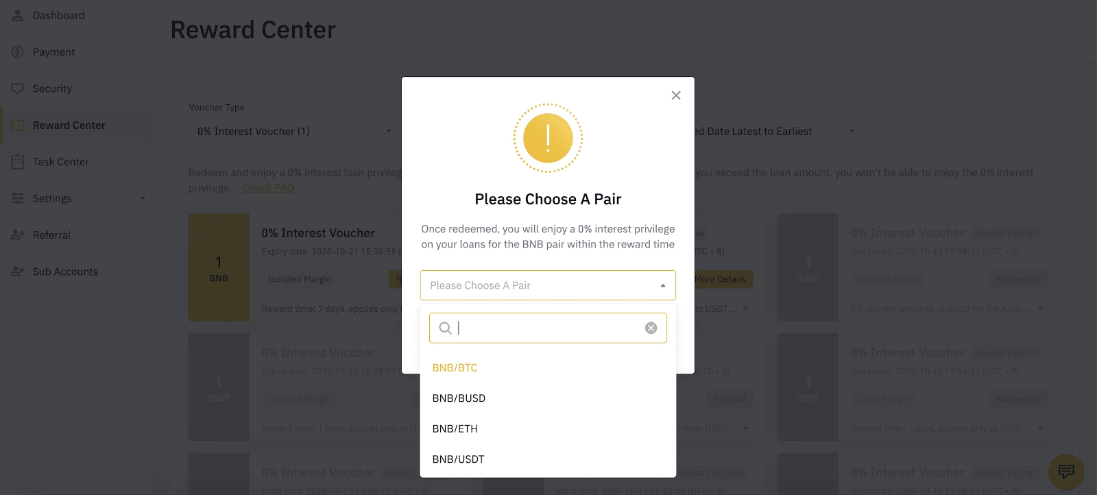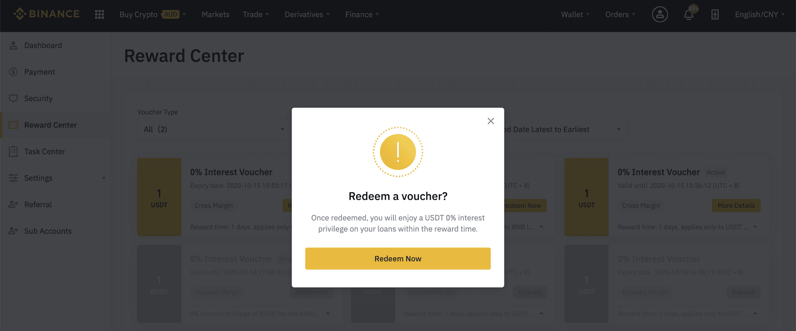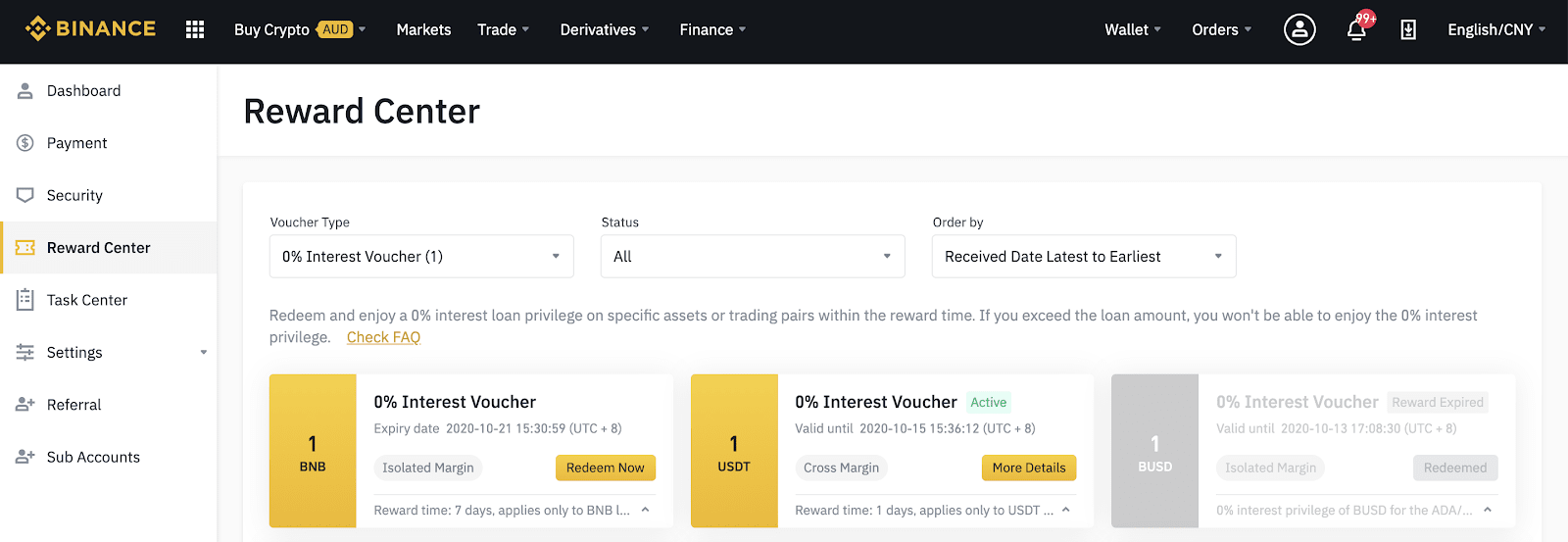 2. Once you receive your Margin 0% Interest Voucher, you will be able to see its Interest-free loan limit(the face value), Currency, Eligibility, Interest-free Reward Time and Expiry Date of the redemption of the voucher in the Reward Center.