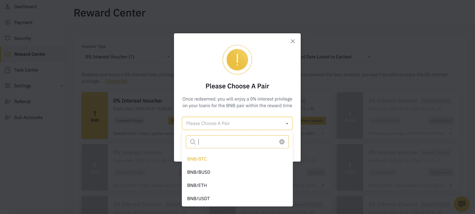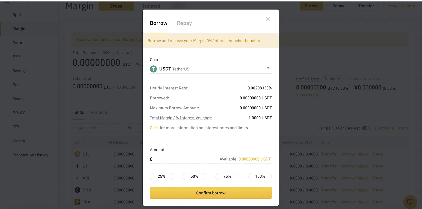 5. There will be a sign adjacent to the name of Cross Margin & Isolated Margin in Wallet - Margin once you have a non-claimed 0% interest privilege; Alternatively you can check how many more amount of 0% interest privilege you can enjoy from the window of Wallet - Margin - Borrow/Repay, and you can jump to the Reward Center from here directly to activate them.