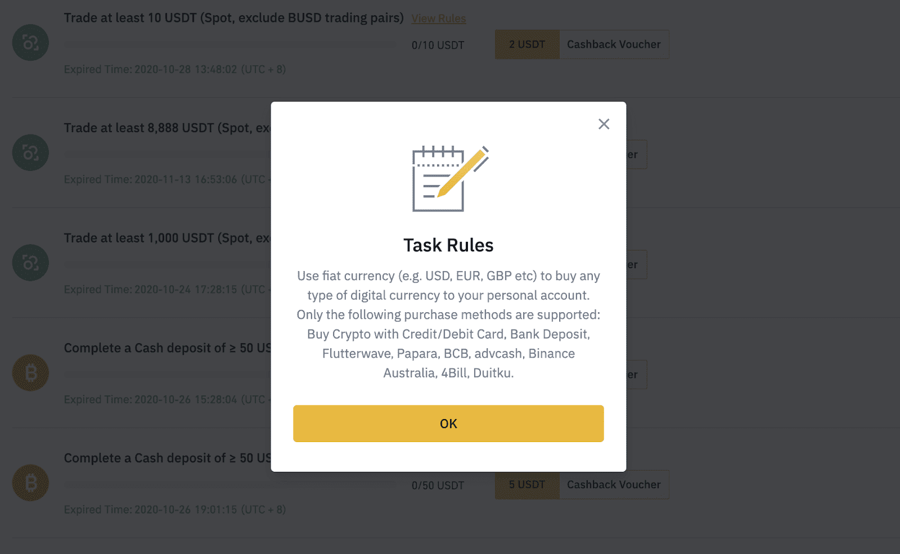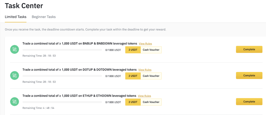 Binance tasks are challenges and criteria that a user can meet to gain some kind of reward. Examples of tasks include making a combined total amount of trades in a certain cryptocurrency, referring a friend, or taking part in some other promotional offer.
