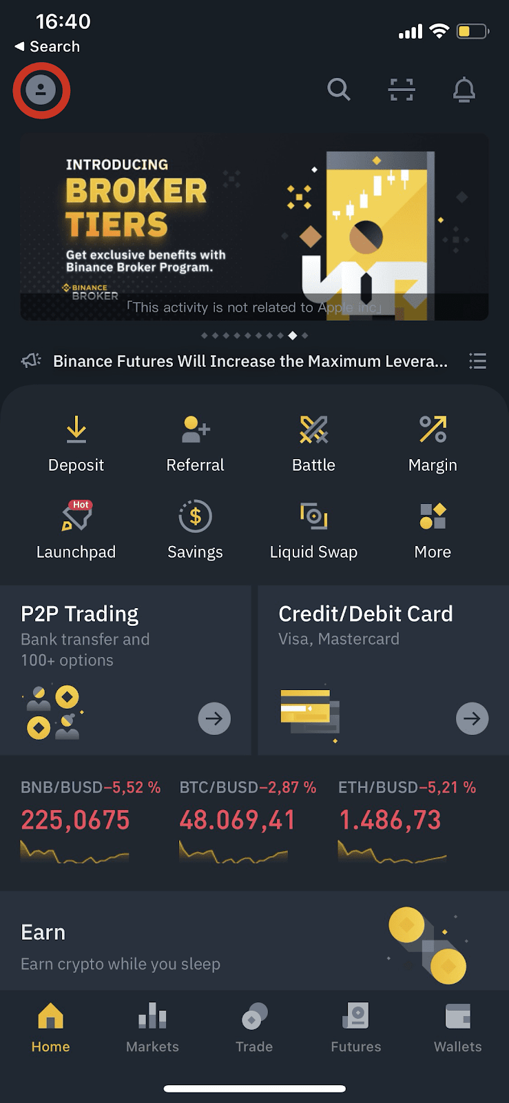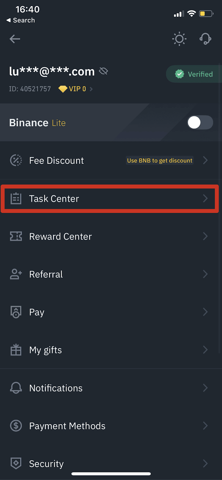 You can also enter the task center in the Binance app by clicking the profile icon and then [Task Center].