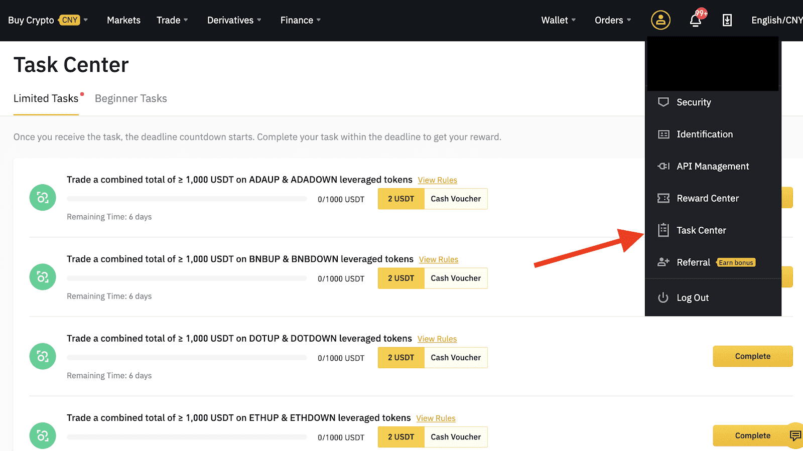 1. Log into your Binance account and click on your profile icon on the upper right corner. You will see the Task Center in the drop-down menu.