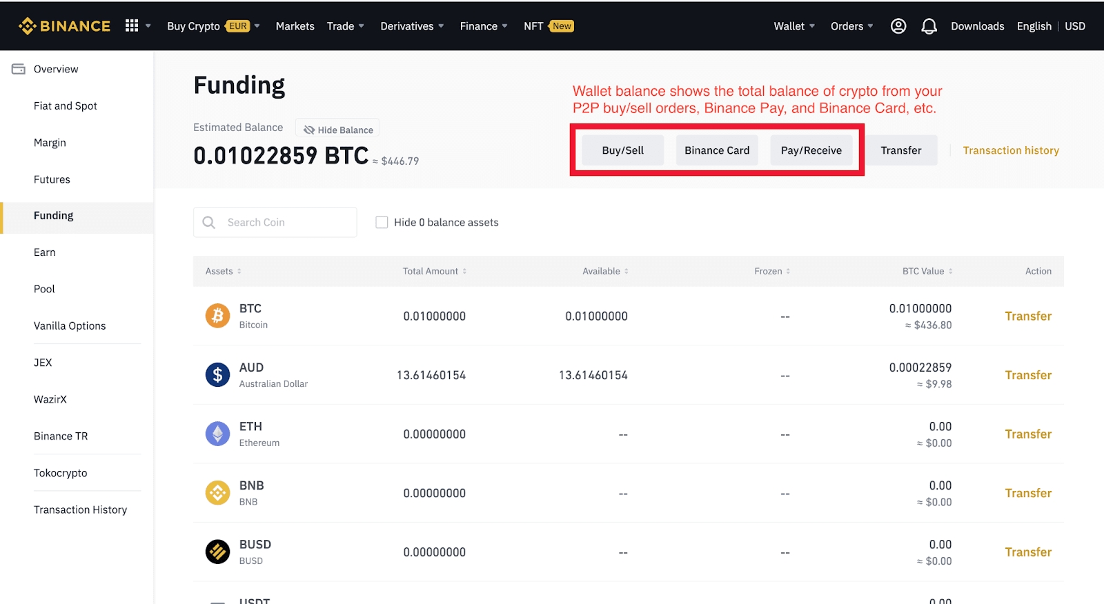 The balance shown on your Funding Wallet includes the total balance of crypto from your P2P buy/sell orders, Binance Pay, and Binance Card, etc.